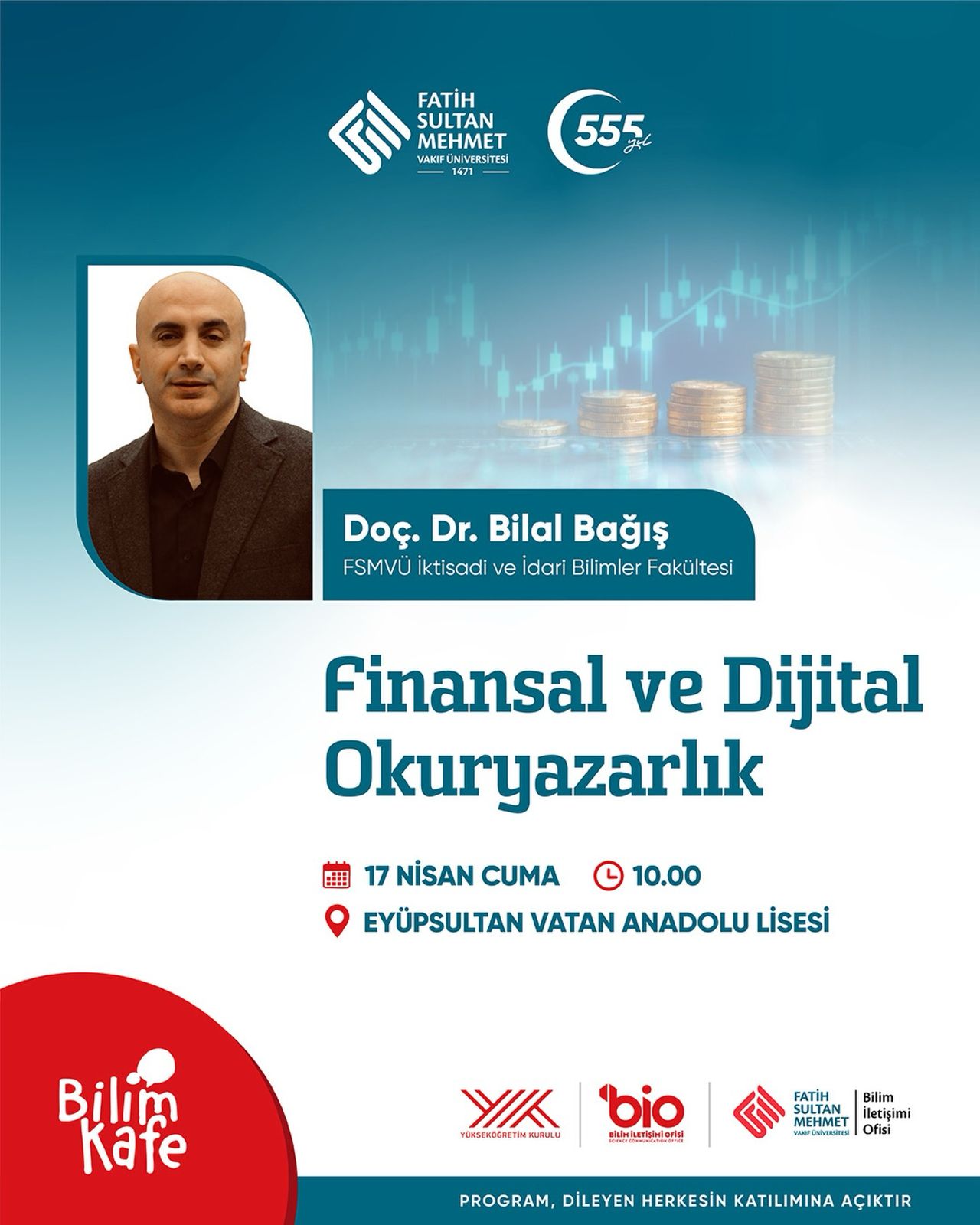 İktisat Bölüm Başkanımız Doç. Dr. Bilal Bağış, Üniversitemiz Bilim İletişim Ofisi tarafından düzenlenen Bilim Kafe etkinlikleri kapsamında, 17 Nisan Cuma “Finansal ve Dijital Okuryazarlık” başlıklı söyleşi için öğrencilerle bir araya geliyor.